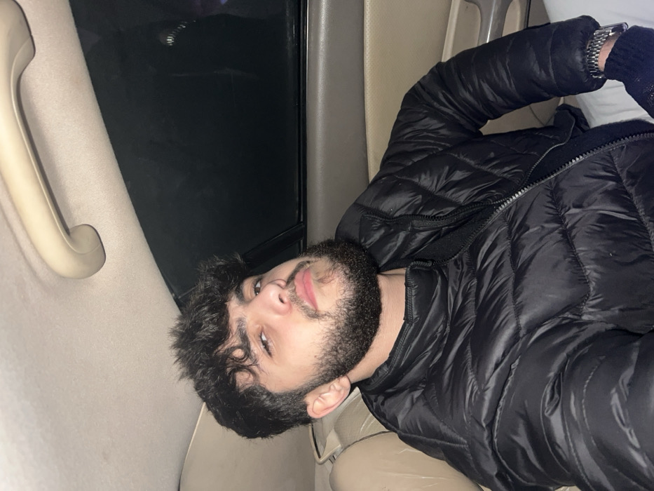 A person with dark hair and a beard is lying down, angled slightly towards the camera