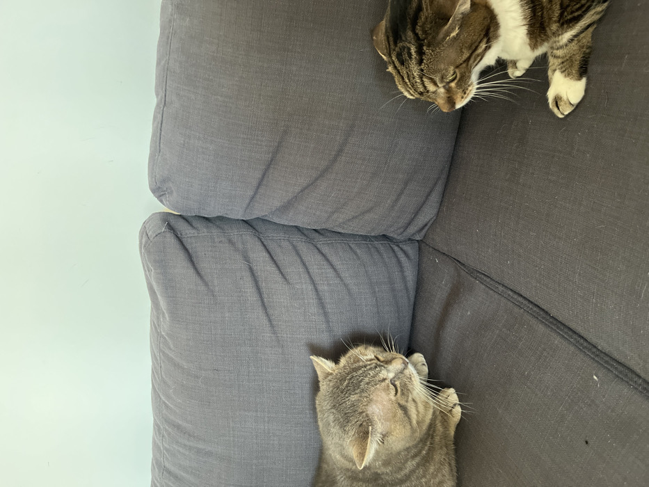 The scene is located in Odesa, Ukraine, depicting an indoor domestic environment. Two feline subjects are positioned on a dark grey fabric sofa. The cat on the left is a grey tabby, lying prone on the left seat cushion, oriented towards the right. Its head is slightly lowered, and its eyes are partially closed. The cat on the right is a brown tabby with distinct white markings on its chest and front paws, also lying prone on the right seat cushion, oriented towards the left. Both cats face a narrow, unoccupied space between them on the sofa. The sofa's upholstery features a visible textile texture and shows minor surface wear. Two dark grey back cushions are prominent behind the cats, separated by a vertical seam. The background consists of a plain light blue-green wall. No human subjects are visible. The lighting is ambient and appears even.