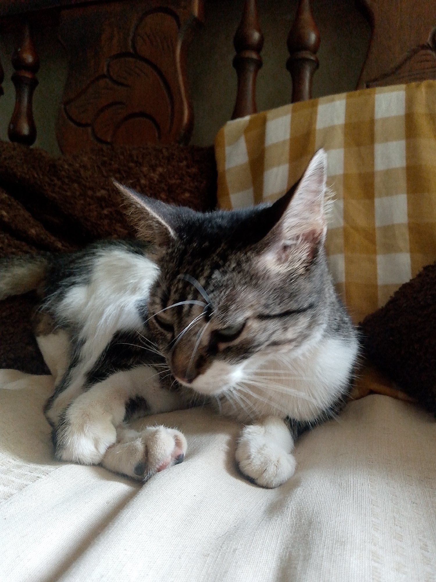 - "A domestic cat is lying on a white cushion" by FM-Oe2JJ3, licensed under CC BY 4.0