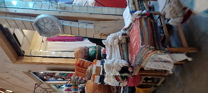 The image depicts an indoor market stall, characteristic of a souk in Marrakesh, Morocco. The scene is dominated by displays of various artisanal goods. In the foreground and mid-ground, numerous stacks of colorful textiles, including patterned blankets or rugs, are arranged on simple wooden display tables. Some textiles feature distinct white fringed edges or pompoms. Behind these, stacks of leather poufs or ottomans are visible, featuring brown and dark green colors. To the far left, another stall exhibits multiple pairs of multi-colored slippers (babouches). The background features an arched doorway with intricate carved wooden trim, opening into an interior space where white and magenta fabrics hang. A dark, indistinct form, possibly a person, is partially obscured behind the stacked goods in the mid-ground. On the right, a circular, woven decorative item with a star-like pattern is affixed to a vertical wooden panel. The walls are light-colored, and the visible floor surface appears to be a uniform light grey. No explicit human actions or interactions are visible.