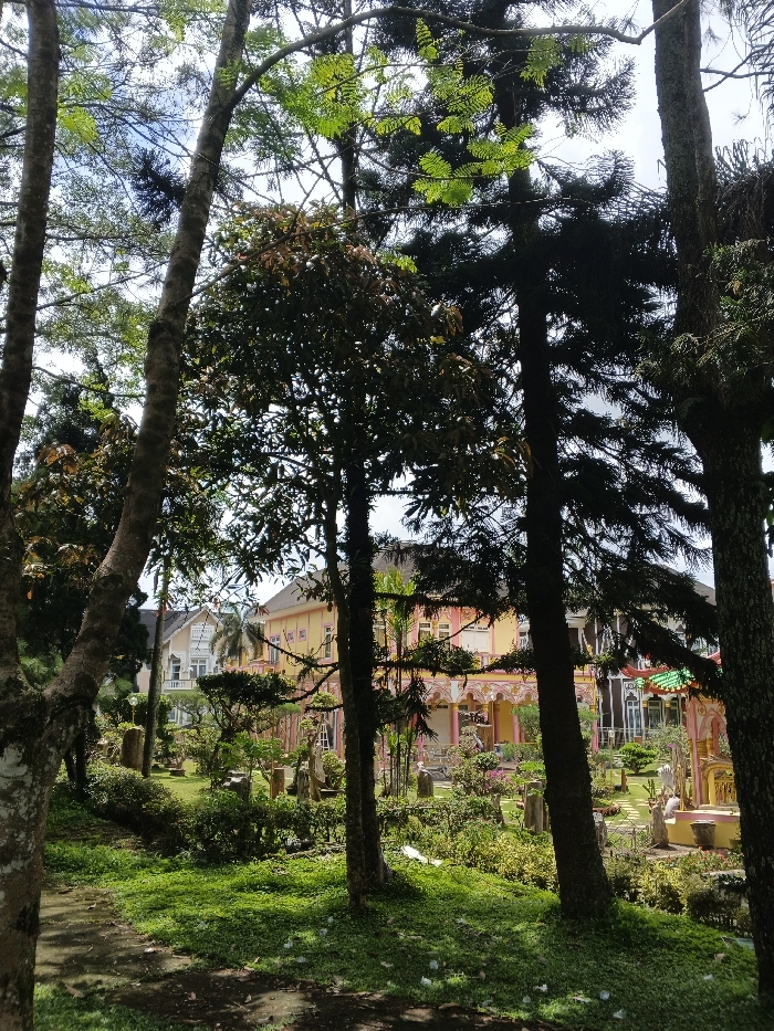 The image depicts a heavily landscaped outdoor area in ឃុំ ផាត់សណ្ដាយ, Cambodia, featuring a foreground of dense foliage and prominent tree trunks