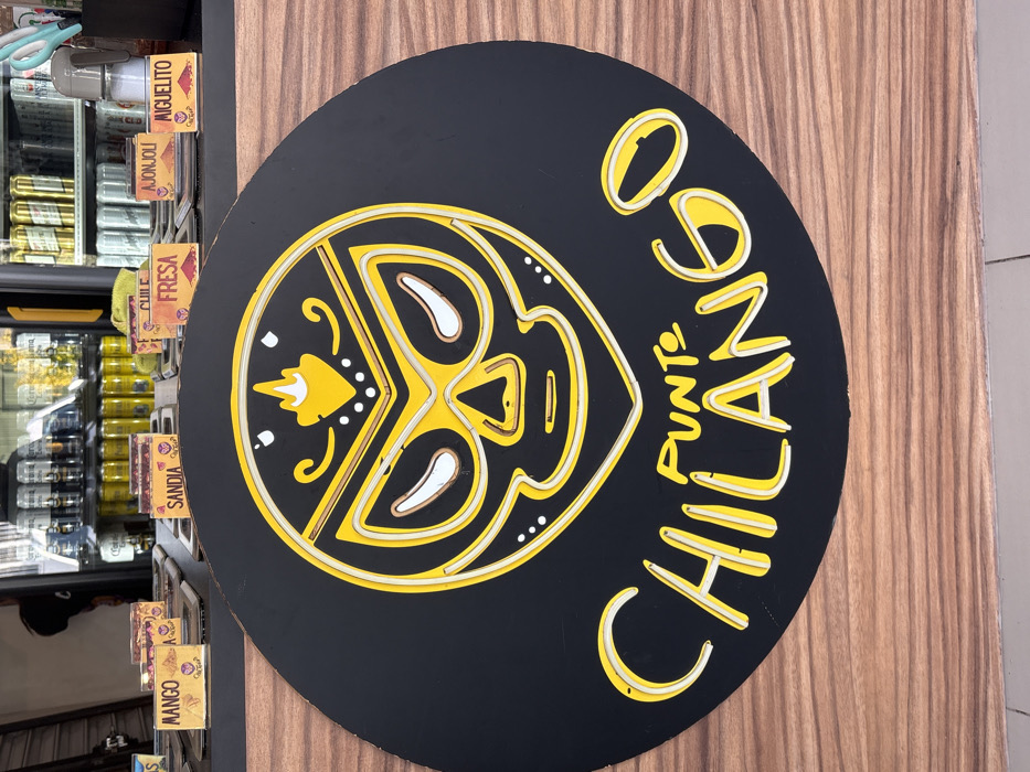A circular sign displays a stylized wrestler mask logo in yellow and white outlines on a black background. The name "CHILANGO," and the word "PUNTO" are written in yellow, with a neon-like effect. The sign is mounted on a wooden surface. To the left, a refrigerator shelf holds various canned and bottled goods with labeled price tags displaying flavors such as "MIGUELITO," "AJONJOLI," "FRESA," "SANDIA," and "MANGO."