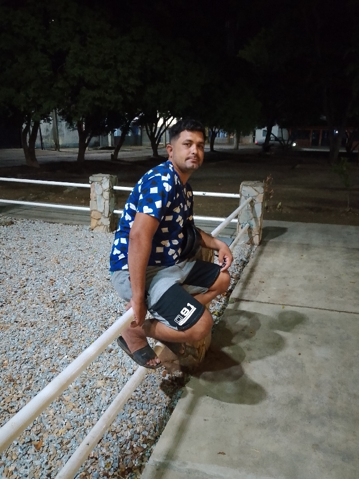 A man with short dark hair and a dark complexion crouches on a white rail fence. He wears a blue patterned shirt, gray and black shorts, and black sandals. The scene is dimly lit, likely at night, with trees visible in the background. The ground is a mix of gravel and concrete. A shadow is visible on the concrete behind the man. The fence has stone pillars at intervals.