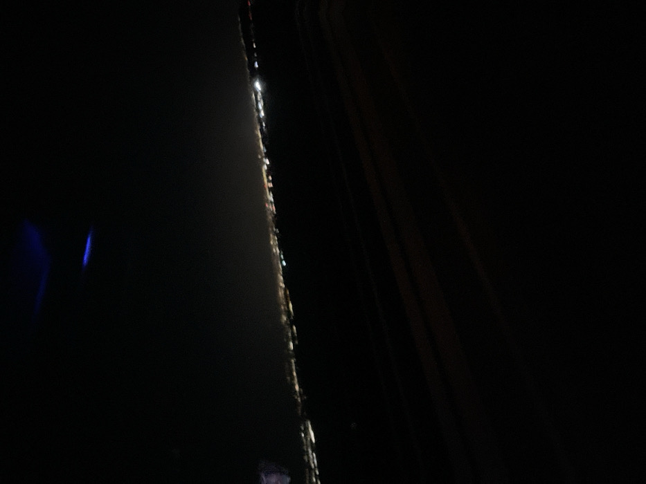 The image captures a nighttime panoramic view of a distant urban settlement, identified as Eleshnitsa, Bulgaria. The upper two-thirds of the frame consist of a dark, featureless sky, with two faint, elongated blue reflections or light streaks visible in the upper-left and upper-middle sections. A horizontal band of numerous artificial lights, varying in intensity and color (predominantly warm white and yellow), stretches across the mid-horizon, defining the presence of a city or town. These lights appear slightly blurred, possibly due to motion during capture or being out of focus. The lower third of the image is characterized by near-total darkness, with faint, parallel horizontal lines or streaks discernible, suggesting an unlit foreground object or an internal surface from the vantage point of the photographer, such as a vehicle interior. No people, specific objects beyond the distant lights, or discernible actions are visible within the frame.