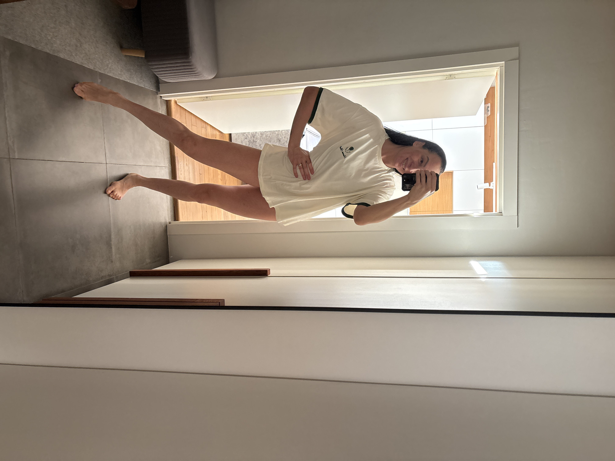 An adult female is captured in a full-length mirror selfie within a domestic interior in the city of Chaikovsky, Russia. She stands barefoot on dark gray tiled flooring, with her left leg extended forward and her right leg slightly bent. She is wearing an oversized, off-white t-shirt with dark green trim on the sleeves and a small dark graphic on the left chest area, exposing her bare legs. Her long, dark hair falls over her shoulders, and she smiles directly towards the camera reflected in the smartphone she holds in her left hand. Her right hand rests on her hip, revealing a ring on her fourth finger. To the left, a portion of a dark gray upholstered bench or ottoman with light wooden legs is visible. Reflected behind the woman, an open white doorway leads to another room with light walls and a wooden accent near the ceiling. To the right of the mirror, a white closet or wardrobe unit with multiple panels and a vertical wooden handle is present.