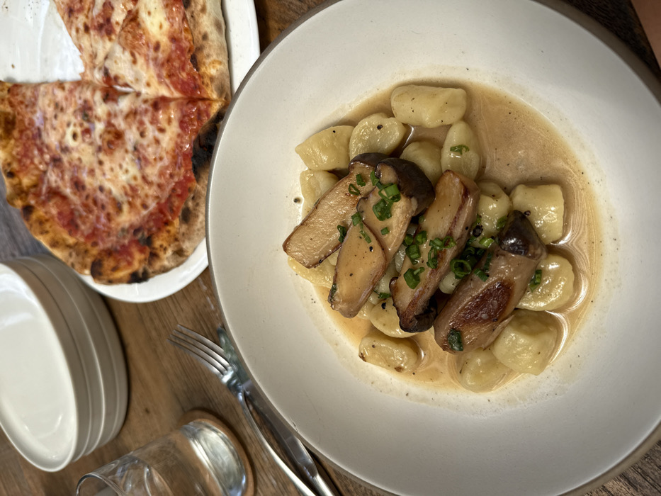 This image captures a dining table scene in Ungasan, Indonesia. In the foreground, a white bowl contains multiple light-colored gnocchi pieces submerged in a light brown sauce. Several slices of brown-capped mushrooms, garnished with chopped green chives, are arranged on top of the gnocchi. To the upper right, a white circular plate holds a partially consumed cheese pizza with a visibly charred crust; two slices remain on the plate. In the upper left background, a stack of four white, rimmed plates is present, alongside a clear glass filled with water, resting on a round, light brown coaster. A silver fork and knife are positioned on the wooden table surface, between the glass and the gnocchi bowl. The table itself is constructed from light brown wood. No individuals are visible in the frame.