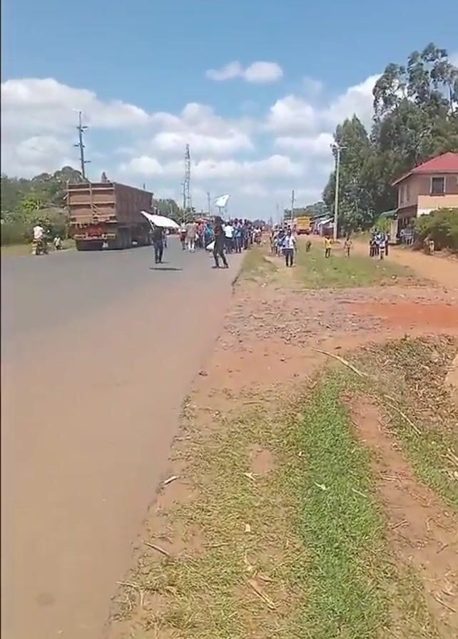 group of people marching on a paved road in a rural area. Some are carrying white flags. There's a large truck parked on the road in the background. On the right side of the road, there is a dirt shoulder with some grass, trees and power lines. One person in the foreground is swinging a stick as they march. The sky is bright blue with some clouds. A few buildings are visible along the right side of the road. There are other cars parked down the road, and a dog and child can be seen walking by.