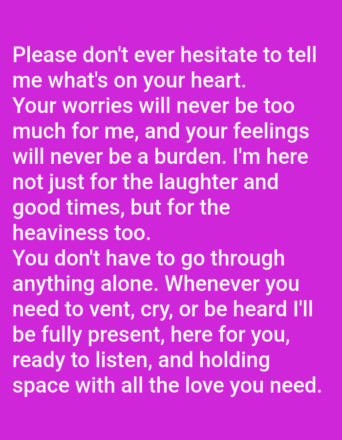 This image is a digital graphic featuring white sans-serif text centered against a solid magenta background. The text conveys a message of emotional support and reads: "Please don't ever hesitate to tell me what's on your heart. Your worries will never be too much for me, and your feelings will never be a burden. I'm here not just for the laughter and good times, but for the heaviness too. You don't have to go through anything alone. Whenever you need to vent, cry, or be heard I'll be fully present, here for you, ready to listen, and holding space with all the love you need." There are no individuals, physical objects, or actions depicted. The image itself provides no visual or contextual information to determine a specific geographic location, including Novo Delchevo, Bulgaria, or any other physical environment.