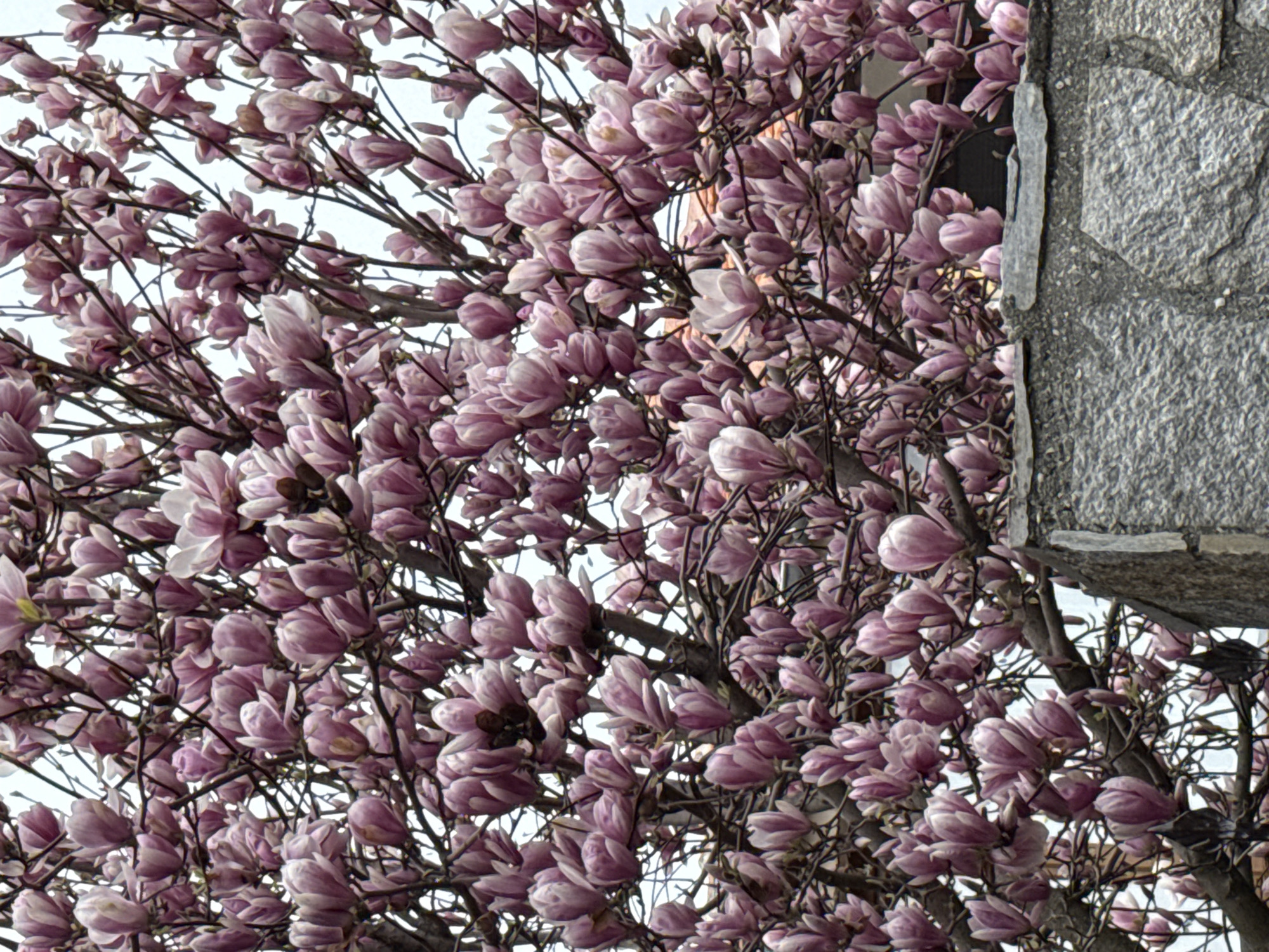 profusion of pink and white magnolia blossoms densely covering a tree's branches. The branches themselves are thin and dark. The blossoms appear to be in various stages of opening. To the right of the tree is a corner of a building constructed from rough-hewn grey stone blocks. The sky is a pale, diffused light behind the blossoms. The location is likely not Sozopol, Bulgaria, as magnolias are not common there.