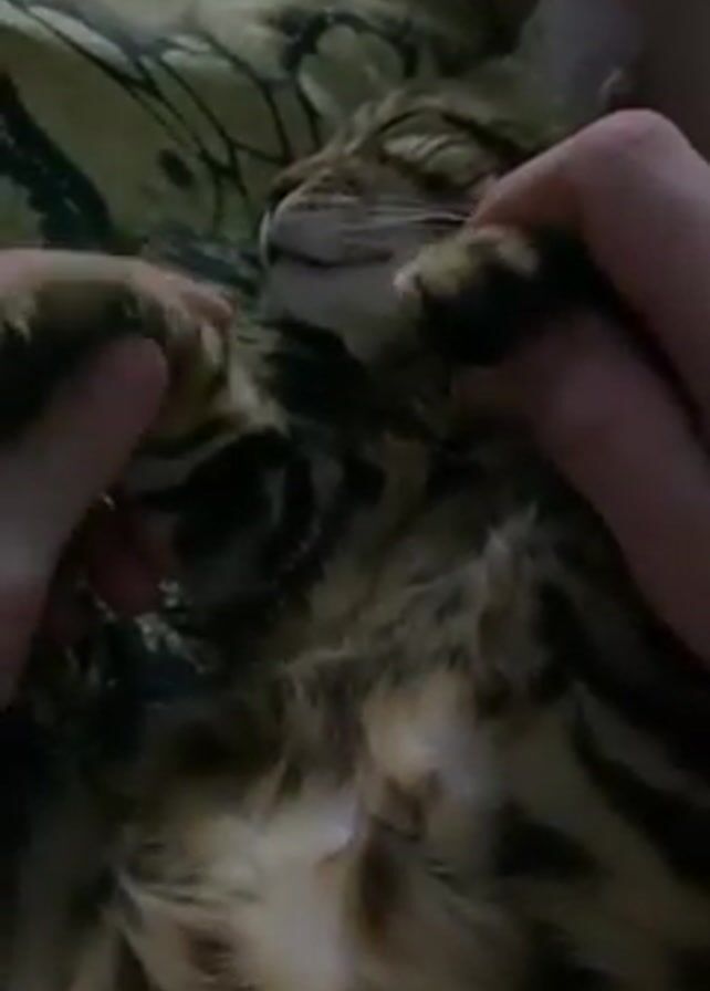 person massaging a cat. The cat is lying on its back with its eyes closed. The person's hands are gently kneading the cat's chest and paws. The cat appears relaxed and content. The background includes what appears to be a patterned blanket or sheet. The lighting is subdued.