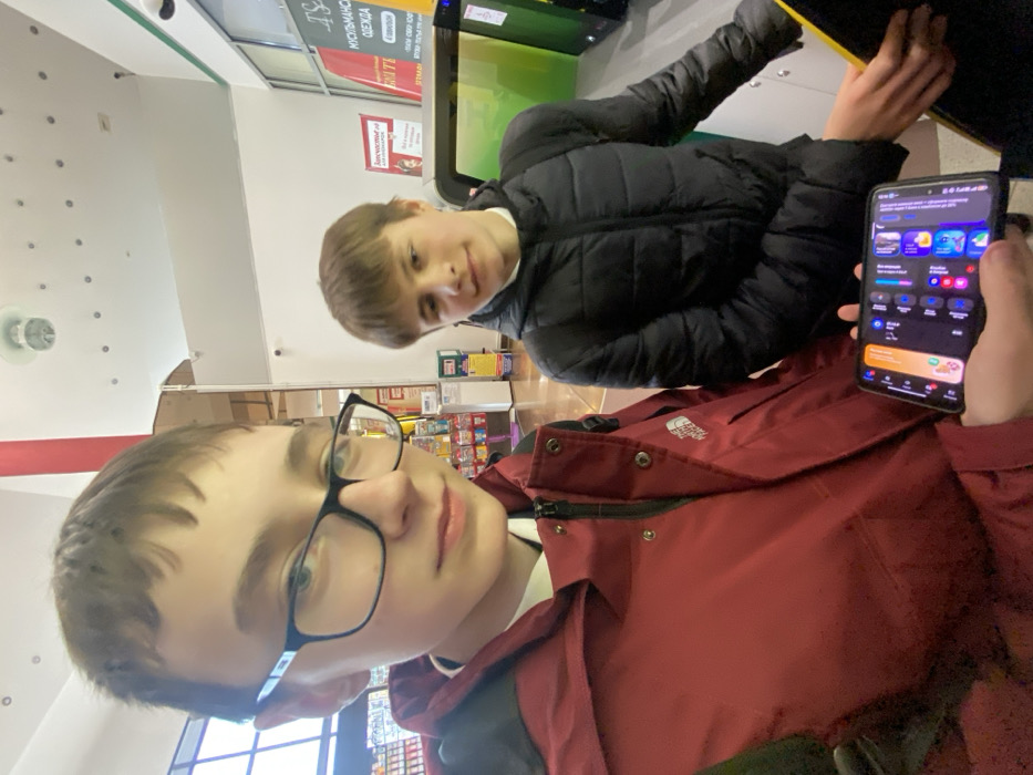 Two adolescent males are depicted indoors within a multi-vendor commercial establishment in Naberezhnye Chelny, Russia