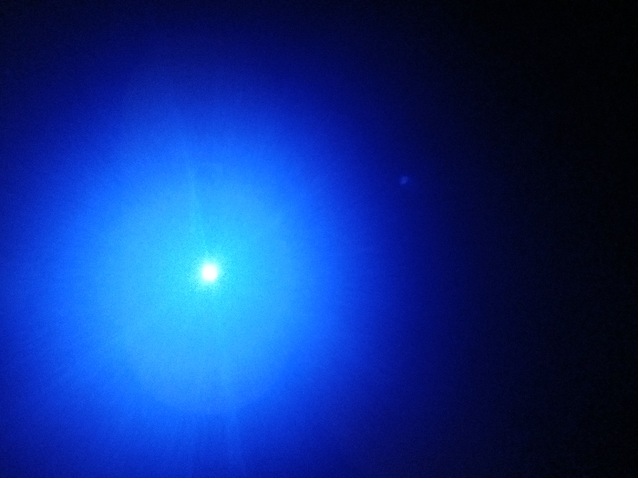 A bright, circular, and intensely blue light dominates the left side of the image, radiating outwards with diminishing intensity