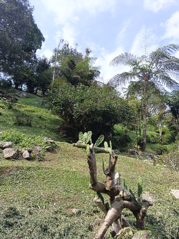 The image presents a sunlit, sloped natural landscape within the city of Masulog, Philippines. In the foreground, a substantial cactus, likely an *Opuntia* species, features a thick, multi-branched woody base supporting several paddle-shaped green cladodes. The immediate ground cover is short green grass with scattered darker grass clippings. The midground shows a gently ascending grassy hillside interspersed with numerous irregular rocks and clusters of shrubs. The background is densely vegetated with a variety of trees, including a prominent tall tree with expansive fern-like fronds on the right side, all set against a sky with scattered white clouds. No people or animals are visible.
