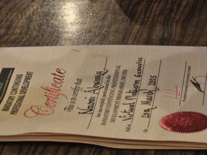 certificate on a brown wooden table. The certificate is folded several times and is made of thick white paper. It has a red stamp at the bottom right corner and a red inscription in the top center that says "Certificate." It is titled "Mandatory Continuing Professional Development." The certificate says "This is to certify that Naomi Alwany has successfully participated in the Mandatory Continuing Professional Development Program INCPD held at - Virtual Platform 5 Session on 20th March 2015." The image is taken in Maiduguri, Nigeria at the coordinates 11.832 latitude and 13.143 longitude.