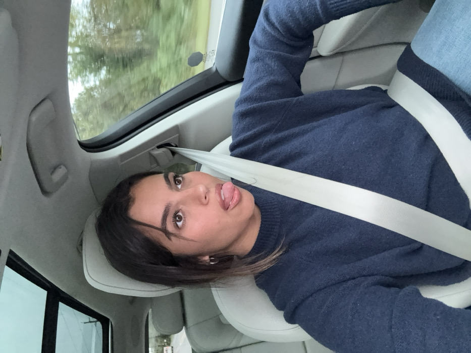 The image depicts a young woman operating a vehicle, located within Lawrence Township, United States. She is seated in the driver's seat, wearing a dark blue long-sleeved sweater and light blue jeans, with a light-colored seatbelt fastened across her chest and lap, consistent with a left-hand drive vehicle. Her dark hair is styled around her face, and she has brown eyes. Her head is turned slightly right, with her gaze directed upward and right, and her tongue is extended from her mouth. The vehicle's interior features light-toned upholstery and a sunroof. Through the driver's side window on the left, a blurred road with a distant, indistinct white vehicle is visible. Through the passenger side window on the right, blurred green foliage and trees are visible, indicating movement. The specific street or precise location within Lawrence Township is not identifiable from the visual evidence presented.