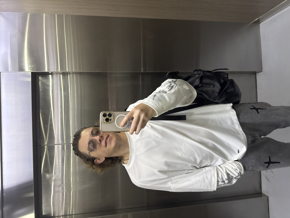 A person is standing in an elevator, taking a selfie with their smartphone. They are wearing sunglasses, a white long-sleeved shirt, and gray pants with a black "X" design. A black leather backpack is slung over one shoulder. The elevator walls are stainless steel, creating a mirrored reflection of the person and their surroundings. The lighting is bright and even.