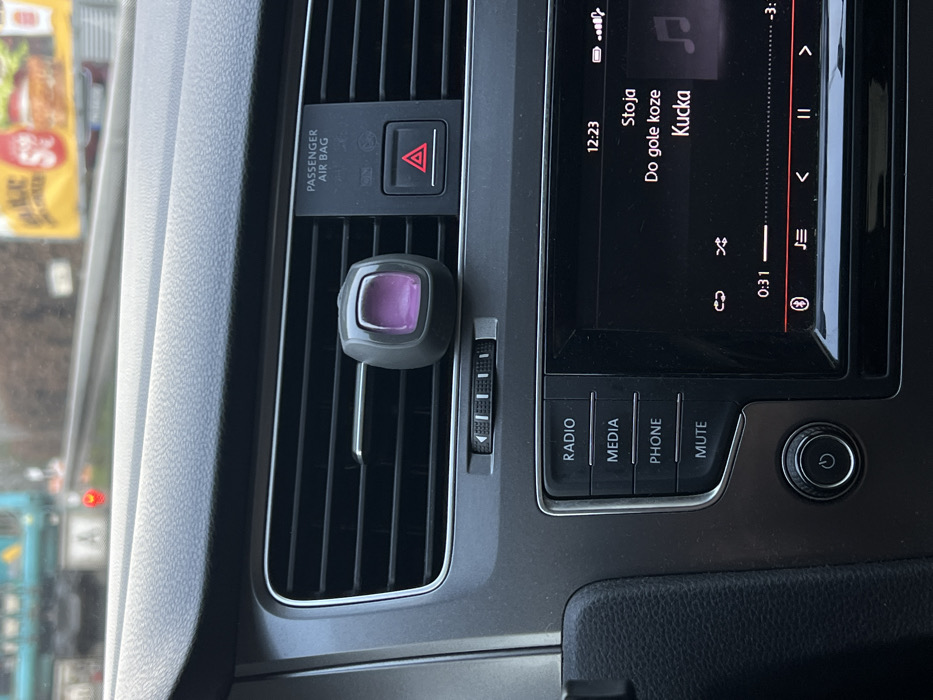 The image captures the interior of a vehicle, viewed from the passenger side, looking forward through the windshield. The foreground is dominated by the dark gray textured dashboard and central console components. A horizontal air vent, part of the vehicle's climate control system, is prominent in the center, with a dark gray, cube-shaped air freshener featuring a translucent purple insert clipped to its louvers. To the right of the air vent, a panel displays "PASSENGER AIR BAG" text and a red triangular hazard light button. Below the air vent and to the left of the infotainment screen, a vertical stack of control buttons is labeled "RADIO," "MEDIA," "PHONE," and "MUTE." A rotary knob with a power symbol is located at the bottom left of this panel. The infotainment screen is active, displaying "12:23" in the upper right corner. Music information is also visible, showing "Stoja," "Do gole koze," and "Kucka," with a playback progress of "0:31" indicated on a timeline. Bluetooth and playback control icons are also present. Through the windshield, a blurred exterior scene indicates a road environment. A teal-colored truck is partially visible ahead in the left lane. Further down the road, a single red light is visible, possibly a traffic signal or vehicle brake light. On the right side of the exterior view, a large yellow Burger King billboard is identifiable, displaying a hamburger image and partially legible text, including "BURGER KING" and "S%" (S with a percentage symbol). The scene is located in Stuttgart, Germany.