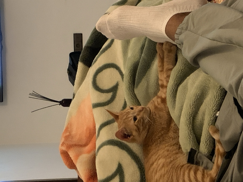 - "The image depicts an indoor scene in M'diq, Morocco, focusing on an orange tabby cat and a portion of a human leg resting on a bed covered with blankets" by FM-db0142, licensed under CC BY 4.0