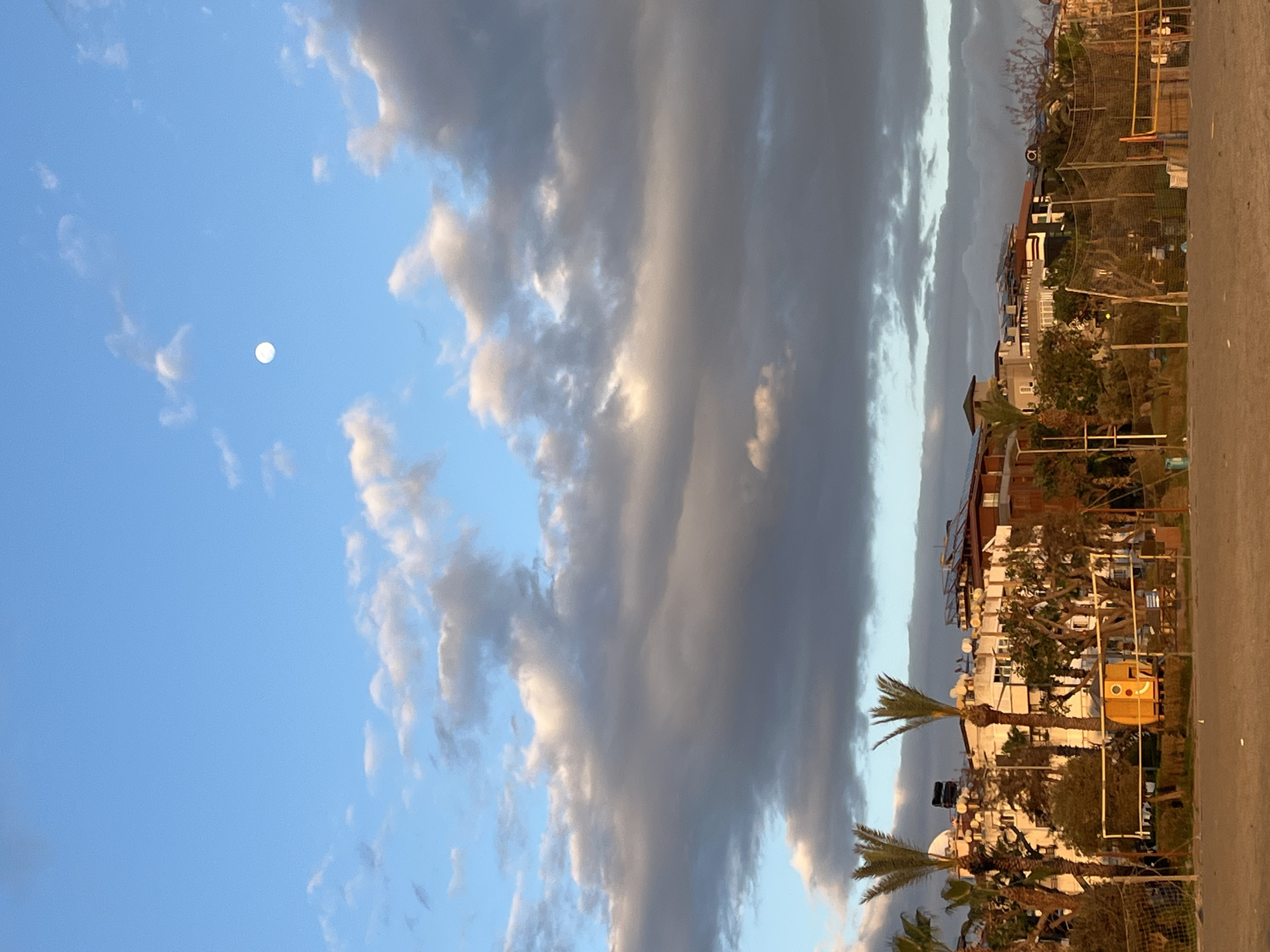 Captured from an outdoor, ground-level perspective, the image presents a landscape transitioning from sky to cityscape, likely in Alanya, Turkey. The sky dominates the left half, showcasing a gradient from deep blue to a light azure, interspersed with clouds that range from thin, wispy formations to thick, looming cumulonimbus shapes. A bright, spherical celestial body, likely the moon, is visible in the upper-left quadrant. The right side of the image portrays a section of what appears to be a coastal urban area. Structures are densely packed, appearing to be a mix of residential and commercial buildings, with architectural details that suggest Mediterranean or Middle Eastern influences. Palm trees punctuate the landscape, indicating a warm climate. A yellow structure resembling a piece of playground equipment or street furniture is also visible. The foreground consists of pavement, defining the boundary of the road, while additional elements such as fences and foliage create depth and layers within the urban scene.