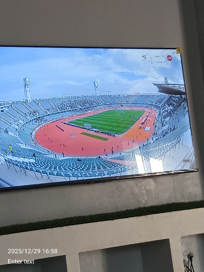 This image, captured on 2025/12/29 at 16:58 in Markurdi, Nigeria, displays a wide-screen television set mounted above a greyish, multi-compartment wall structure. A narrow strip of artificial green grass is positioned horizontally between the television screen and the wall structure below it. The television screen occupies the majority of the upper frame and displays an aerial view of a large, multi-purpose sports stadium under a partly cloudy blue sky. The stadium features a central green football pitch with white markings, encircled by a reddish-orange athletics track. Tiered seating, predominantly light blue or grey, fills the stadium bowl. Numerous spectators are visible in various sections of the seating, particularly in the lower and middle tiers, while some upper sections appear less occupied. Several small figures, presumably players or officials, are present on the pitch and along the track. Two tall floodlight towers are visible within the stadium, one on each side. Broadcast overlays are visible in the upper right corner of the screen, including a letter 'S', 'CAF' (Confederation of African Football), and a red circle with the word "LIVE", indicating a live broadcast.