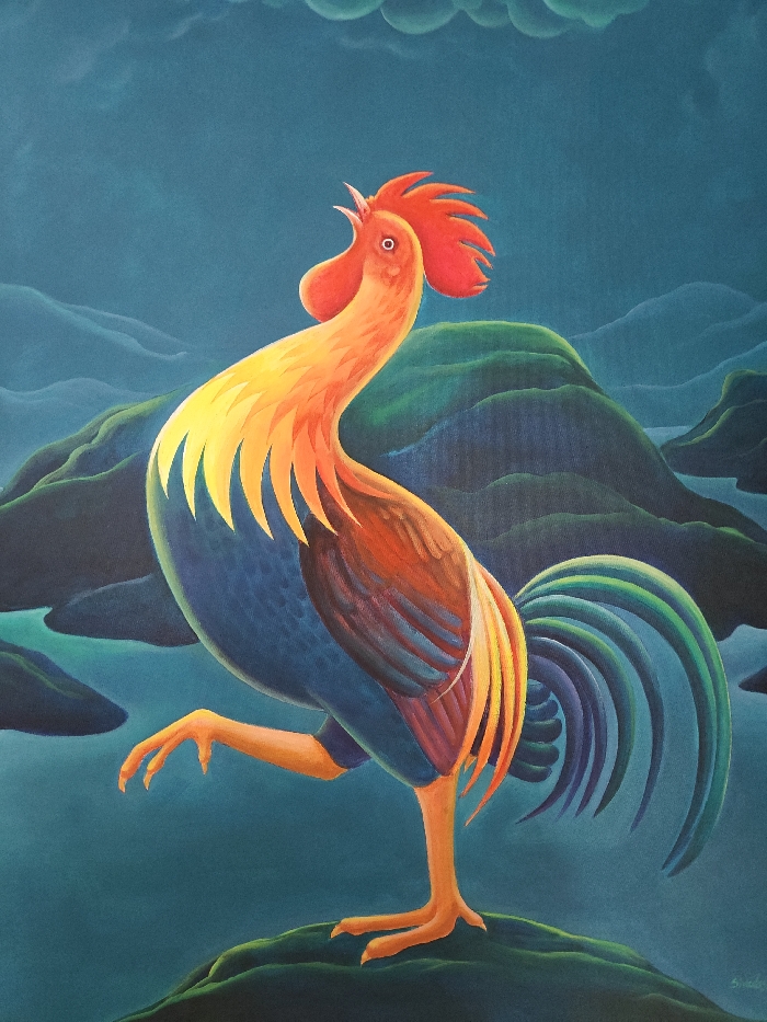 This image is a vertical painting featuring a stylized rooster against an abstract landscape