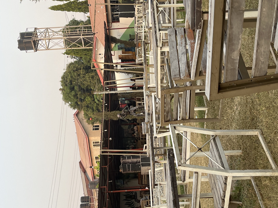 Outdoor seating area of a restaurant or bar is displayed. Rows of empty wooden tables and chairs dominate the foreground. Buildings with red and white exteriors are in the background, along with trees. A water tower is on the left. The atmosphere is casual, with a mix of natural and built environments. The scene appears to be captured during the day with a somewhat hazy sky.