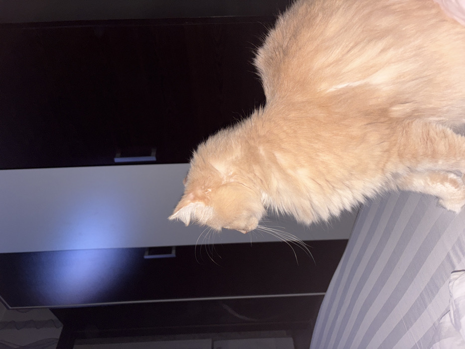 The image depicts an indoor domestic setting, presumed to be within Vratsa, Bulgaria. A light orange, medium-haired feline is positioned on a bed in the foreground, facing towards the left side of the frame. Its head is turned to the left, with prominent white vibrissae extending forward. The bedding beneath the cat displays a horizontal stripe pattern in shades of light grey and white. In the background, a multi-panel wardrobe is visible. The wardrobe features dark brown or black sections, with one central panel appearing lighter, possibly white or reflective, which shows a distinct blue light reflection. Silver-colored, horizontal bar handles are discernible on the wardrobe doors. The environment is consistent with a dimly lit interior space, likely a bedroom.