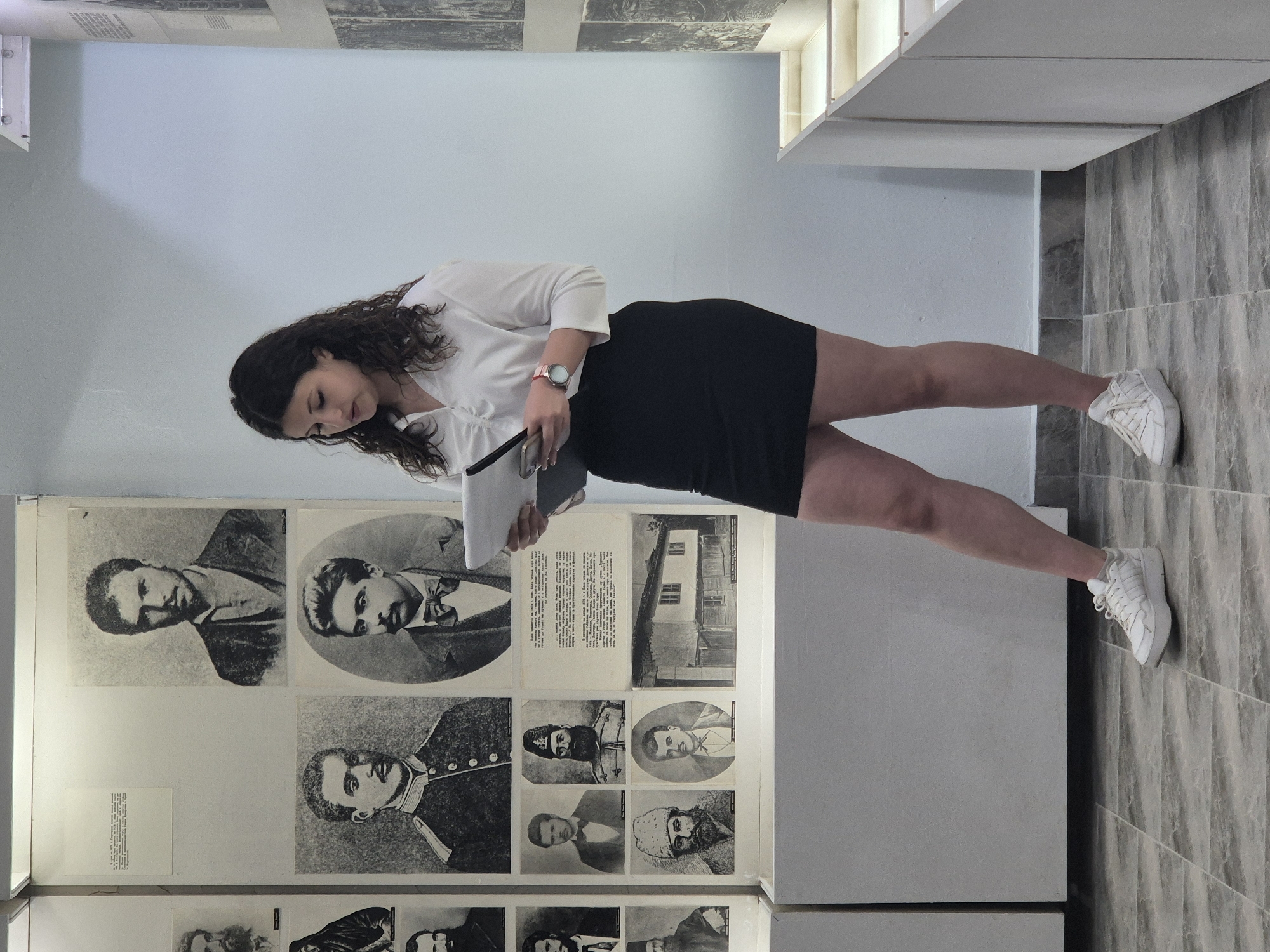 A young woman with dark hair stands in what appears to be a historical museum or exhibit hall in Byala Cherkva, Bulgaria. She is dressed in a white blouse, a black skirt, and white sneakers, and she is holding a book or folder in her hands, looking down at it. Behind her is a display panel featuring black and white portraits of historical figures and printed text. The room has light blue walls, a tiled floor, and overhead lighting fixtures. The overall impression is that she is a visitor engaged in reading about the exhibit.