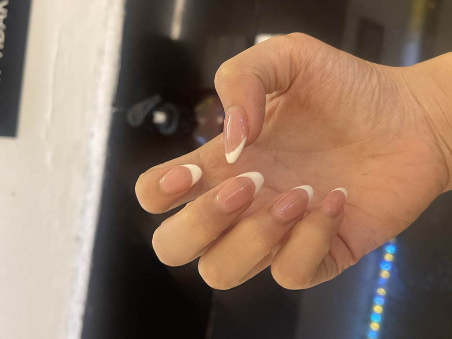 A close-up, high-angle photograph presents a human hand with fingers slightly splayed and the palm oriented downwards. The hand exhibits a light-to-medium skin tone. All five visible fingernails are manicured in an almond shape, featuring a classic French design with a translucent pink base and distinct white tips. The background is out of focus. A horizontal white surface is present in the upper mid-ground, with a darker area above it containing indistinct white text, part of which appears to be the Indonesian word 'TIDAK'. Below the white surface, a dark, reflective countertop is visible. On the right side of this surface, a dark-colored pump bottle dispenser is partially obscured. The lower-left background displays a horizontal line of blurred, colored lights, primarily blue and yellow/orange. This scene is located in Pacet, Indonesia. The specific address or commercial establishment within Pacet is not discernible from the visual information provided.