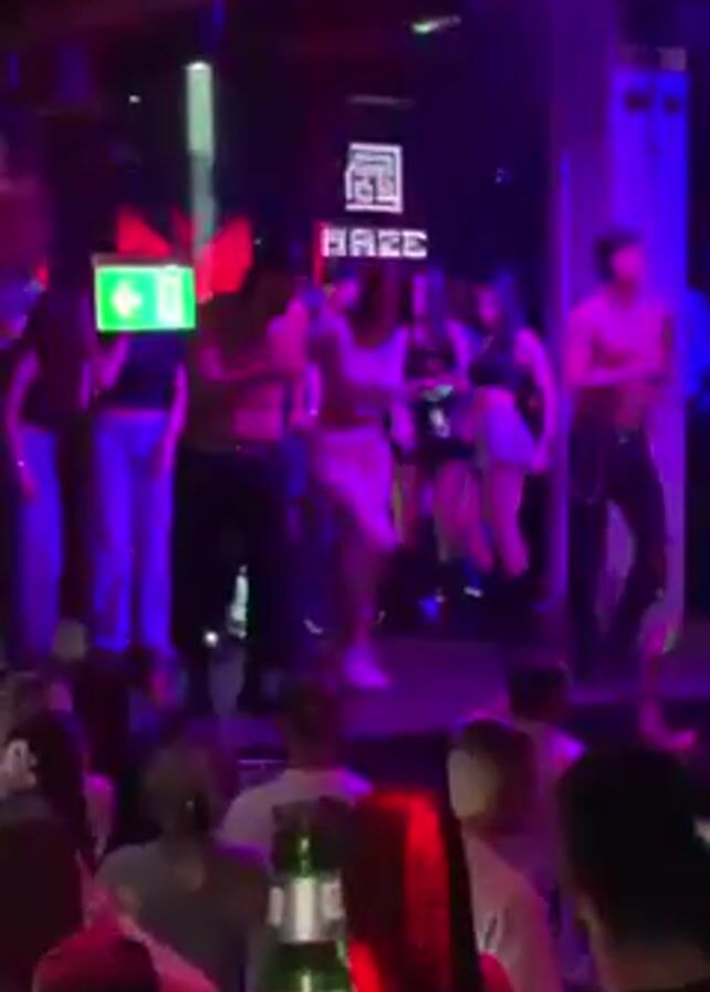 The video depicts a lively scene inside a nightclub, with a group of people dancing on a stage. The stage is lit up with various colors of lighting. The crowd appears to be enjoying the music and the performance. The nightclub features a large screen displaying the club's name, "HAZE." The dancers on stage include shirtless men and women. The rest of the crowd is observing and dancing.