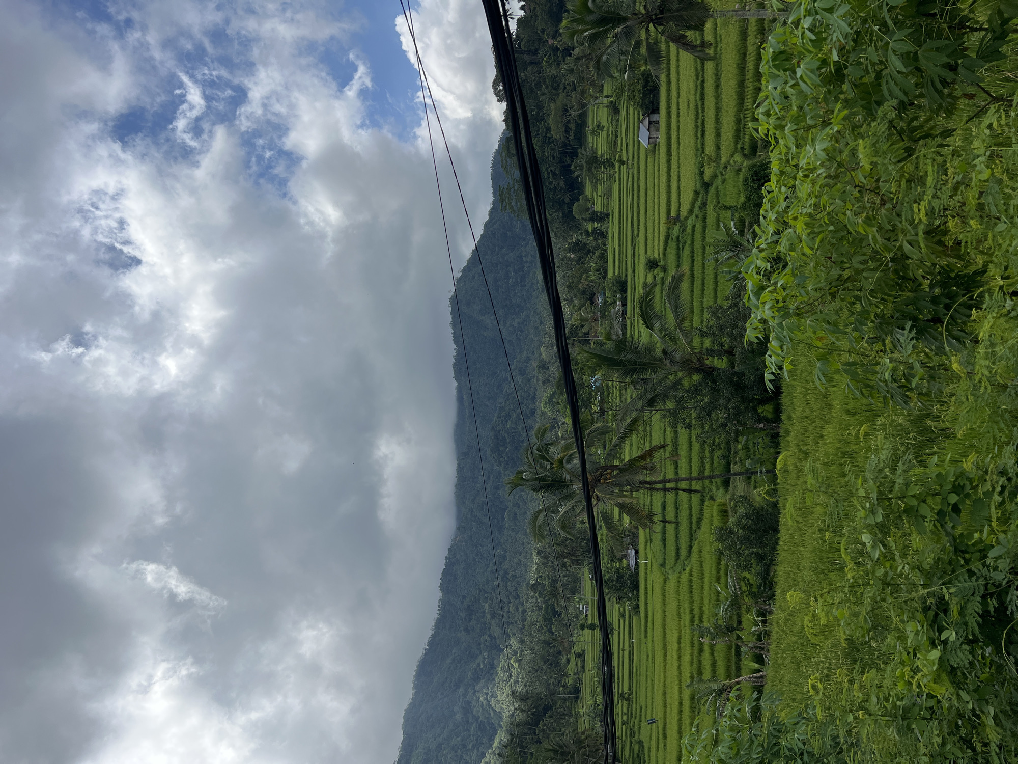 A landscape photograph, rotated 90 degrees counter-clockwise, depicts rice paddies in Bebandem, Indonesia