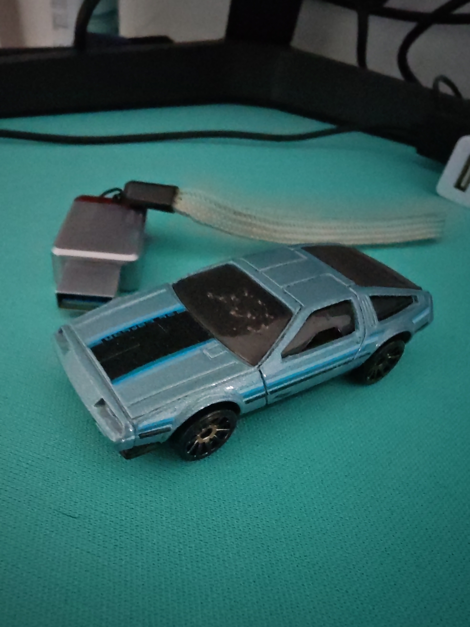 The scene depicts two primary objects on a textured, teal-colored surface. In the foreground, a light blue die-cast toy car, resembling a DeLorean DMC-12, is positioned diagonally, facing towards the upper left. It features black and blue racing stripes on its hood and sides, dark tinted windows, and black wheels with gold-colored hubs. Behind and to the left of the toy car rests a silver-colored USB drive, connected to a white lanyard that extends towards the upper right portion of the frame. The background is out of focus, revealing a dark, indeterminate object, possibly a monitor stand, with a black cable visible running horizontally across it. The environment appears to be an indoor setting, likely a desk or table, under artificial lighting. No individuals are present, and no specific actions or interactions are evident. The precise location within the city of La Plata, Argentina, cannot be ascertained from the visual information provided.