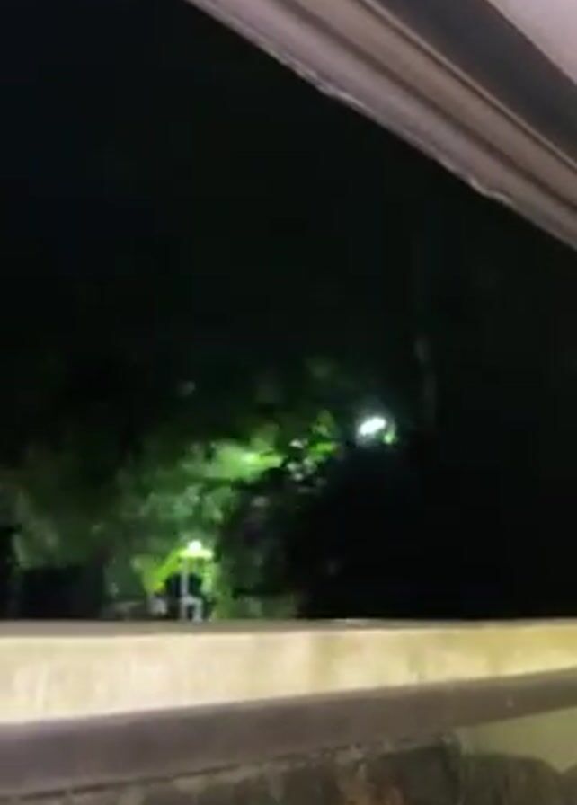 view from inside a moving train at night, with the landscape visible through the window. The night sky is dark, punctuated by street lights and the silhouettes of trees passing by quickly. Reflections of people inside the train can be seen in the window. The train appears to be moving at a considerable speed, blurring the objects outside.