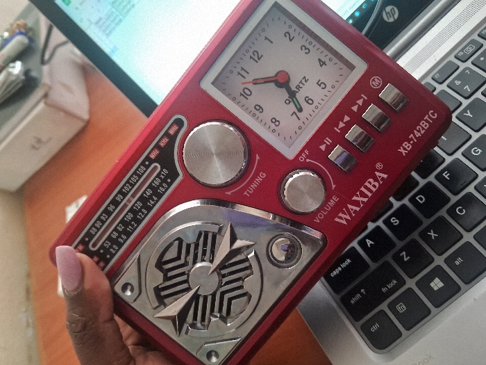 A red "WAXIBA® XB-742BTC" radio, a model with an analog clock