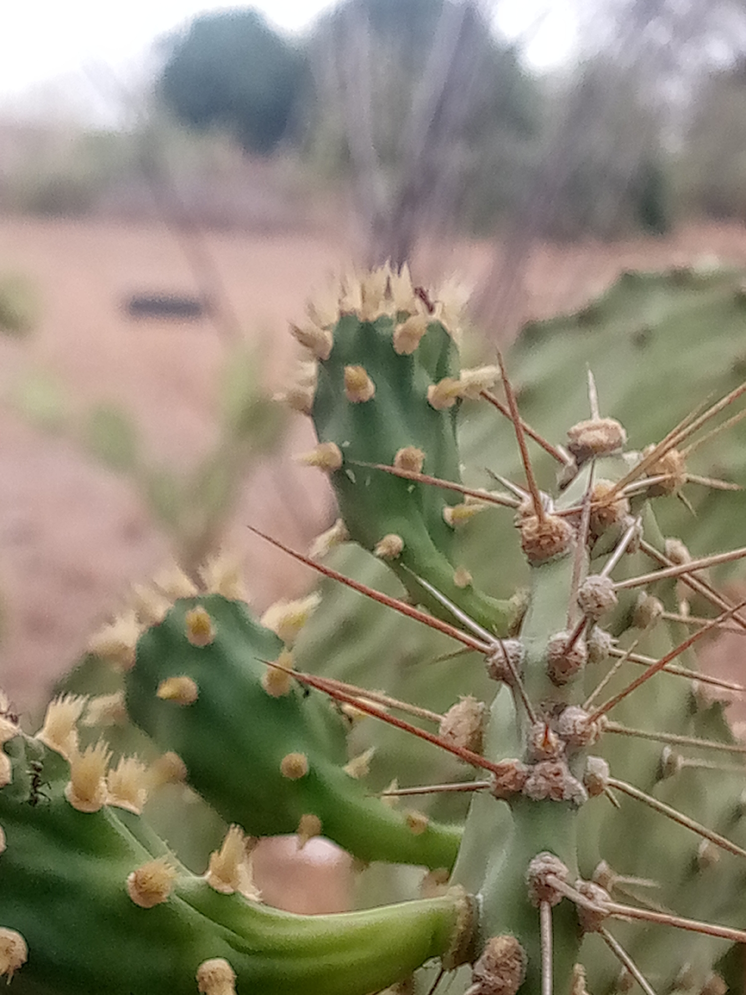 A close-up shot depicts a green cactus plant with numerous spines. Some spines are long and brown, while others are shorter with yellow tufts. The background is blurred, showing hints of brown earth and indistinct greenery. The location is not deducible from this image.