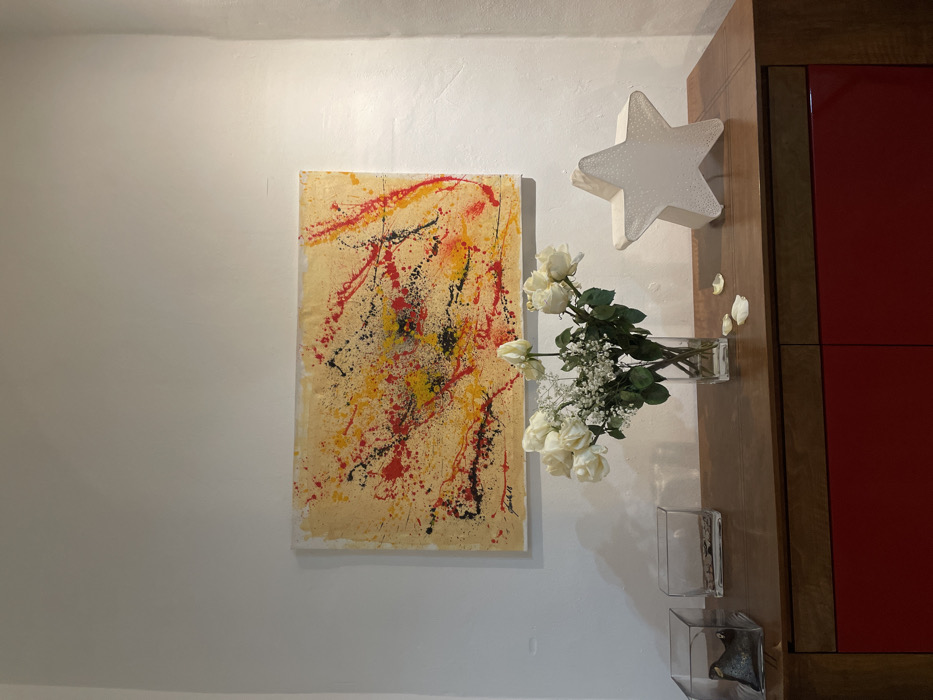 A vibrant abstract painting with splatters of red, black, and yellow hues on a beige backdrop hangs on a white wall