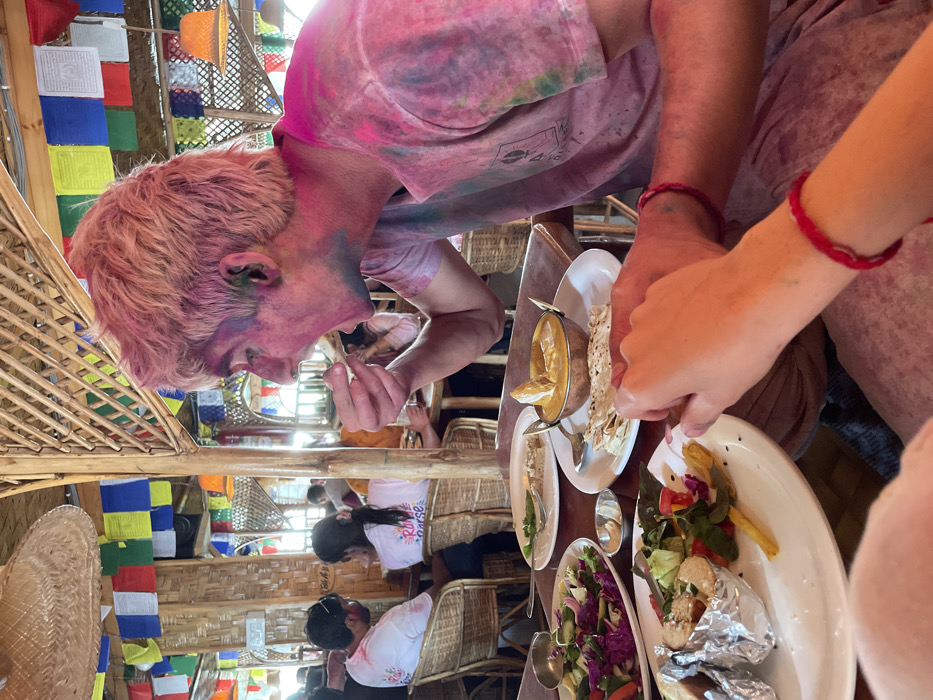 A casual dining scene is captured within a bamboo or wicker-structured restaurant in Rishikesh, India. Colorful Tibetan prayer flags are strung across the ceiling beams. In the foreground, a male individual with light-colored hair, facing right in profile, brings a piece of food to his open mouth. His face, neck, and light pink t-shirt are extensively smeared with pink, blue, and green powdered dyes, indicative of Holi celebration participation. He wears a red braided bracelet on his left wrist. Opposite him, the hands and forearms of a second individual are visible on the wooden table, also wearing a red braided bracelet on their right wrist. The table displays several dishes: a large white plate of green salad with red cabbage and other vegetables, a white plate with a copper bowl containing yellow curry and multiple flatbreads, and another white plate holding foil-wrapped items, a side salad, and yellow fried food. In the background, other patrons are visible seated at similar wicker tables and chairs. Two individuals directly behind the primary male subject are seen, both with color powder on their white t-shirts, one bearing partial text "Run a..." The lighting suggests a bright daytime setting.