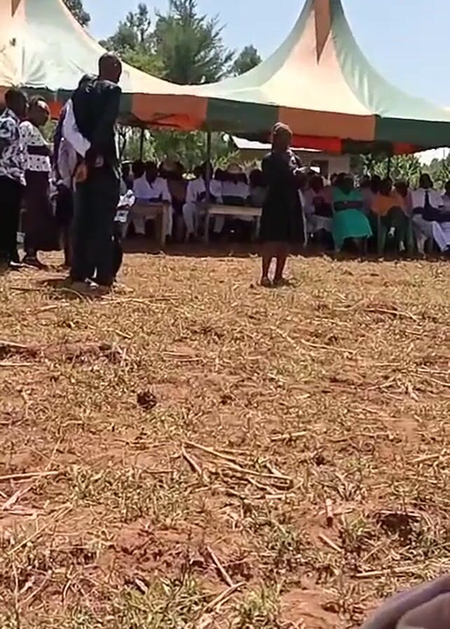 In an outdoor setting, under two tents, an audience is seated watching a woman speak into a microphone. She is wearing a black dress and standing on a grassy field. To her left are three people, one in a suit, another in a button-down shirt, and another dressed similarly. The audience is seated on chairs and benches, mostly dressed in white or light-colored clothing. The sky is clear and bright. The ground is dry and patchy with brown and green vegetation.