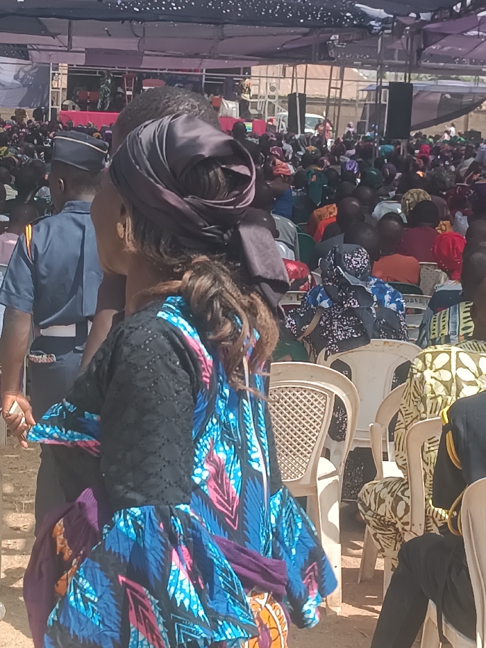 An outdoor gathering of people seated in chairs under a shaded area. Focus on a woman with a dark headwrap, wearing a colorful blue and purple patterned dress with black lace sleeves. A uniformed man stands nearby. Many other individuals fill the background, seated in rows, facing a stage with speakers and equipment, suggesting a ceremony or event.
