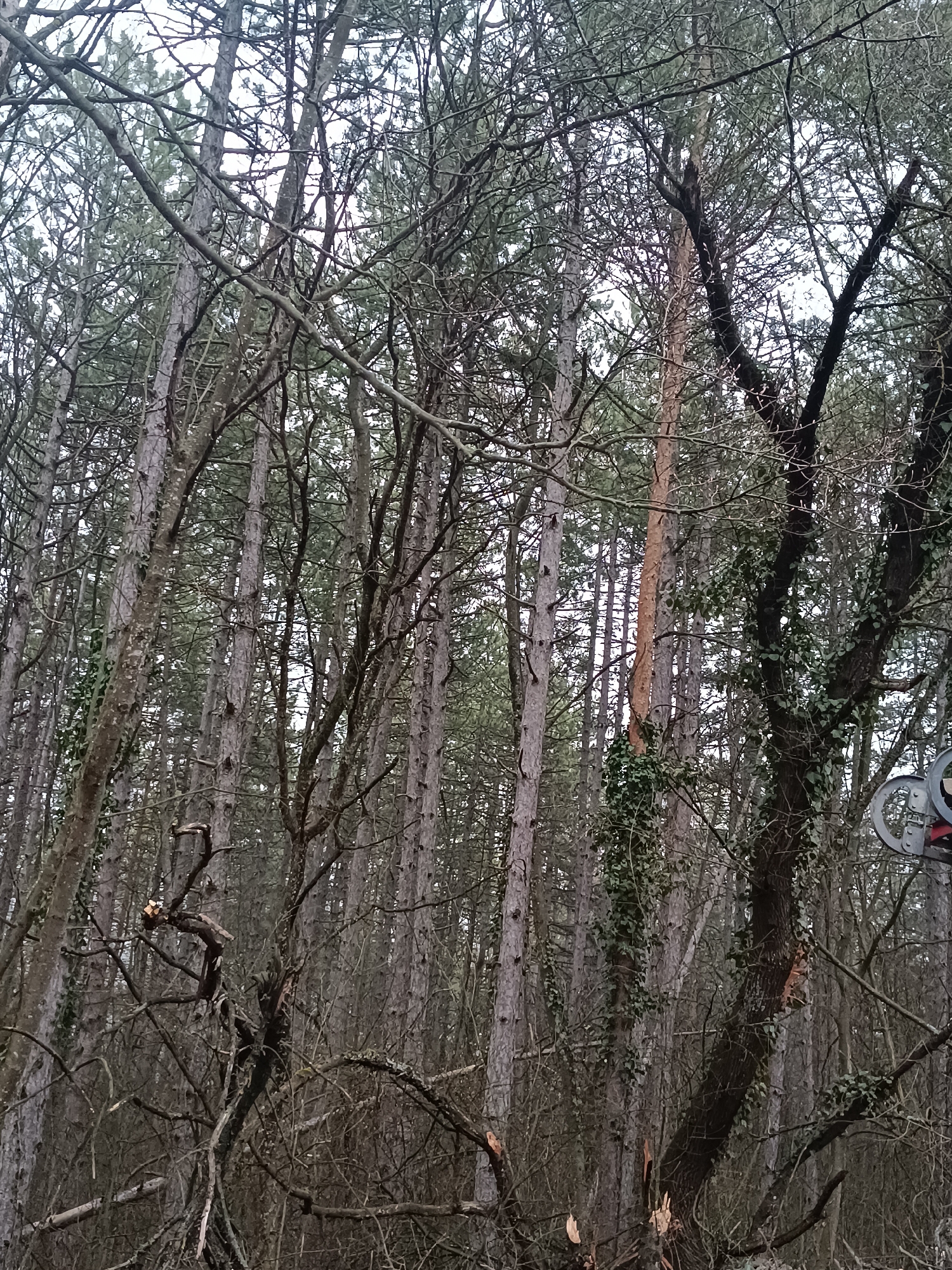 The scene depicts a dense forest located in Lozevo, Bulgaria, under an overcast sky. The environment is dominated by numerous tall, slender conifer trees with gray-brown trunks and green foliage primarily concentrated at their upper portions, extending vertically to fill the frame. In the foreground and midground, a network of bare, dark brown deciduous branches, some appearing broken or twisted, obstructs a clear view into the deeper forest. One prominent conifer trunk towards the center-right exhibits a significant area of lighter, reddish-brown exposed wood, suggesting bark loss or damage. Another darker, thicker tree trunk in the mid-right is extensively covered with dark green ivy-like climbing vegetation. Several jagged wood splinters are visible near the base of this tree and on other lower branches, indicative of recent breakage. In the upper right corner, partially obscured by branches, is a segment of a mechanical structure; it features at least two metallic, circular or wheel-like components in grey, attached to a visible red structural element. No human subjects are present.