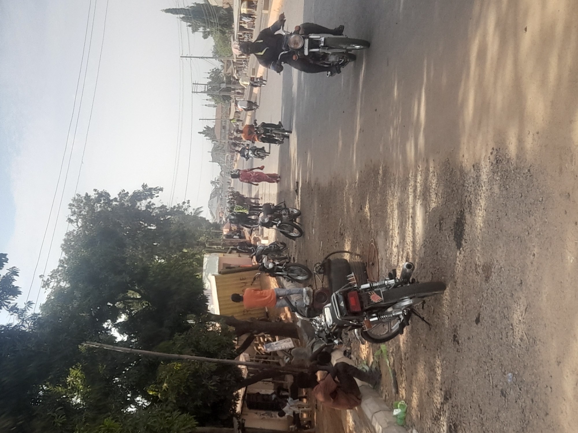 This image depicts an active street scene under daylight conditions. The specific location in Ube, Nigeria, is not discernible from the visual evidence. The foreground on the left features a dirt and gravel shoulder adjacent to a concrete curb. A dark-skinned male, dressed in a brown shirt and dark pants, is seated on this curb, facing towards the right side of the frame. To his right, a black motorcycle with chrome accents is parked on its kickstand, positioned with its rear facing the viewer. Behind this motorcycle, a used tire and what appears to be mechanical equipment are visible. Further left and back, partially obscured by trees, another individual in an orange shirt stands near a yellow, corrugated metal structure. The road occupies the midground and extends into the background. It is a two-lane asphalt surface that transitions to a more unpaved, dusty appearance on its left edge. Several individuals are present on the road. In the immediate midground on the right, a dark-skinned male in a black shirt and dark pants, possibly wearing a dark face covering, rides a silver-colored motorcycle directly towards the viewer. Another dark-skinned male in an orange shirt and blue jeans rides a motorcycle away from the viewer, closer to the center of the road. A female individual in a red or maroon patterned dress walks on the left side of the paved road, also moving away from the viewer. Multiple other pedestrians and motorcyclists are visible further down the road, receding into the distance. The background reveals a series of low-rise buildings and structures, some partially obscured by dense green foliage from trees lining both sides of the thoroughfare. Power lines traverse the upper portion of the sky, which appears light and somewhat hazy. In the far distance, distinctive architectural features, possibly including minarets, are visible on some buildings against the light sky. The overall environment suggests an urban or semi-urban setting with unpaved areas and roadside activity.