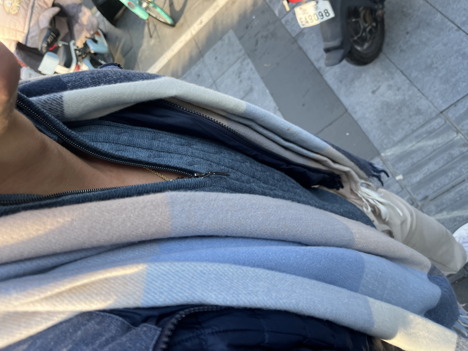 The image captures a close-up, high-angle view of a person standing on a paved surface in Dongcheng District, China. The individual wears a dark blue zippered puffer jacket, partially open, over a blue cable-knit half-zip sweater, also unzipped, revealing a gold chain necklace. A large plaid scarf in shades of light blue, beige, and white is draped around the neck. The lower body shows light beige trousers and white shoes. The environment consists of a grey paved sidewalk. In the background, parts of multiple vehicles are visible, including a light blue scooter, a green bicycle, and a dark-colored scooter or motorcycle displaying a white license plate with the alphanumeric sequence "E49098". The scene is illuminated by natural light, indicating daytime. No specific actions or interactions are depicted beyond the individual standing.