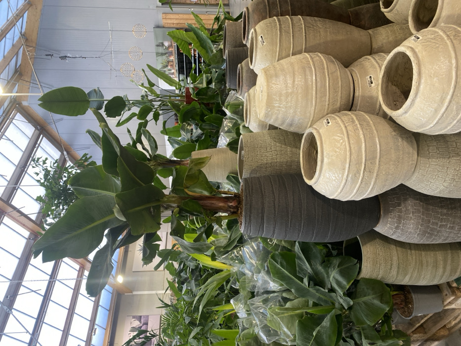 This image depicts an interior scene within a commercial establishment, specifically a garden center or plant nursery, located in Mouscron, Belgium. The scene is dominated by a dense arrangement of lush green foliage and a large display of decorative planters. In the foreground and midground, several large, broad-leafed plants, consistent with banana plants (Musa species), are presented in tall, textured cylindrical pots. One prominent specimen in the center is housed in a dark gray pot with horizontal wave-like textures, while another on the right is in a lighter gray pot. Surrounding these larger plants are numerous smaller green plants, some bundled and encased in clear plastic wrap. To the right and in the center-foreground, a substantial collection of ceramic or stone-like decorative pots is stacked. These pots vary in shape from rounded, urn-like forms to more cylindrical or vase-like structures, and exhibit diverse textures including horizontal ribbing, dimpled surfaces, and a rough, patterned finish. Their colors range from dark gray and muted green to light beige and off-white. Several pots have small white labels affixed to their rims. The overhead structure consists of a transparent or semi-transparent roof, likely glass or polycarbonate panels set within a grid of wooden beams, providing natural light. Artificial light fixtures are visible, including a notable arrangement of four spherical, illuminated elements suspended from the ceiling on the right side. In the background, shelving units stocked with additional plants are discernible against light-colored wall panels. Wooden pallets are partially visible on the ground to the left, used for displaying plants. No individuals are present within the frame.