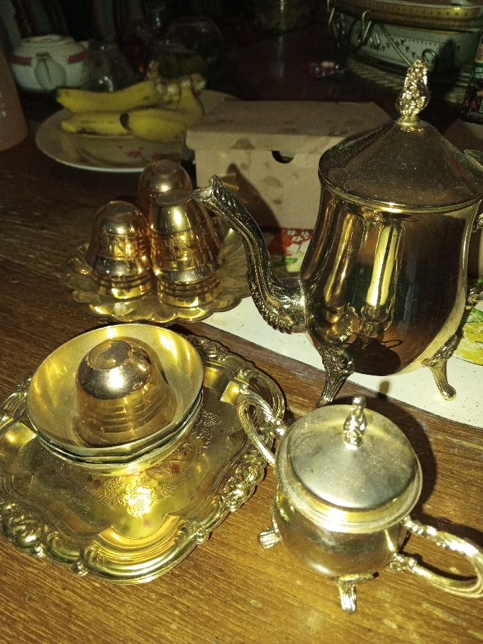 - "The scene depicts a collection of golden-colored metallic tableware on a dark wooden surface, presumably indoors, in Longmiang, Laos" by FM-sU0PJ2, licensed under CC BY 4.0