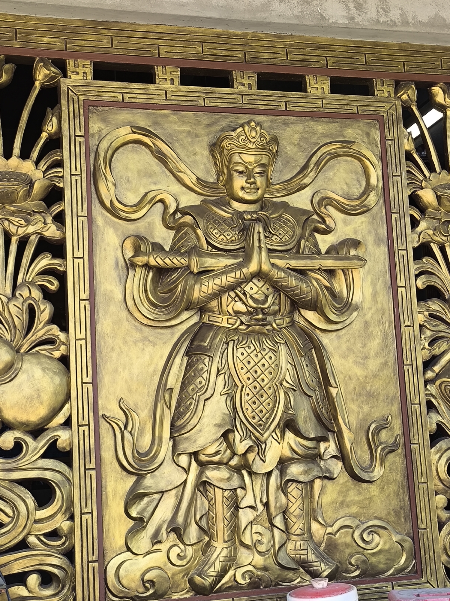 A close-up shot showcases a golden, ornate, relief carving of a deity or historical figure, possibly located in Unknown, Vietnam. The carving is set within a rectangular frame adorned with detailed patterns. The figure is depicted with hands clasped in a gesture of respect or prayer, wearing intricate armor, and standing on what appear to be stylized clouds. Two long, curved ribbons emanate from behind the figure's head, adding a sense of movement and dynamism. The frame and surrounding decorative elements feature lotus-like flowers and swirling, foliage-inspired patterns, executed in the same golden hue. The relief's texture reveals the intricate details of the carving and casting process. The lighting highlights the raised portions of the relief, emphasizing the three-dimensional aspect of the artwork.