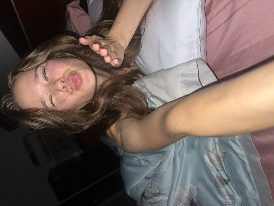 The image captures a selfie of a young female indoors, likely in a bedroom or hotel room
