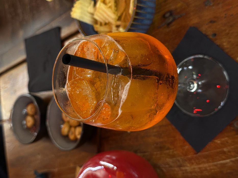 - "An aerial shot showcases an orange cocktail with ice cubes and a black straw in a large, rounded glass" by FM-n65LK2, licensed under CC BY 4.0