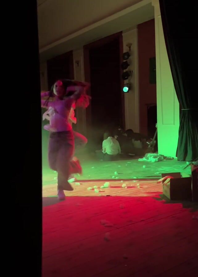 Two women dance on a wooden stage strewn with debris. The stage is bathed in alternating red, blue, and green light, with visible smoke effects. Some seated observers are visible at the back of the stage. The scene is framed by dark curtains on either side, providing a glimpse of the performance from the wings.