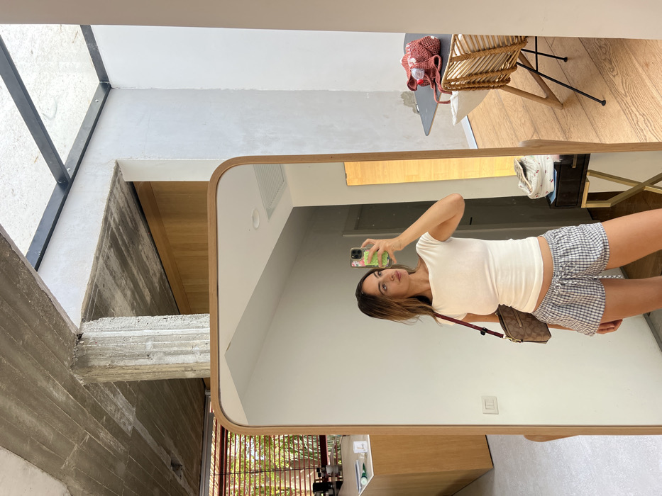 A female subject is depicted in a mirror selfie, standing indoors in Herzliya, Israel. She possesses long, brown hair and is attired in a white, short-sleeved boat-neck top and grey-and-white plaid drawstring shorts. A small, patterned shoulder bag with a dark red strap hangs on her left side. She holds a smartphone with a green and pink patterned case, using it to capture her reflection. The background visible outside the mirror's frame features an interior space with an exposed, rough concrete ceiling and a prominent concrete column. To the left, a light wooden counter is present, displaying small objects, behind which a window with horizontal blinds reveals green foliage. To the right, a dark-colored table holds a red, net-like bag containing several white, spherical objects. A wicker-style chair with black legs is positioned next to the table. The flooring appears to be hardwood, and white walls are visible throughout the space.