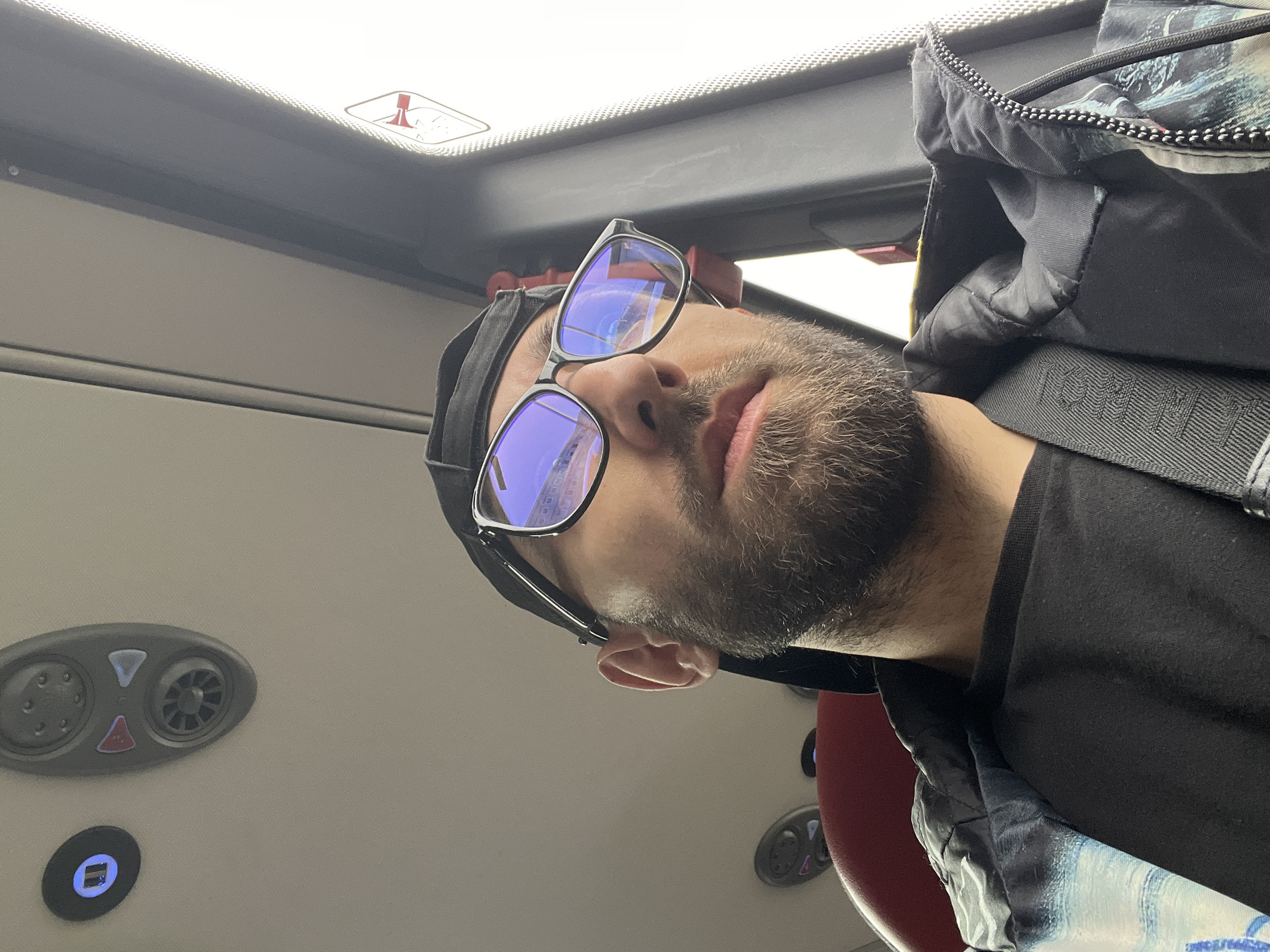 A male individual is depicted in a medium close-up, seated inside a public transport vehicle, likely a bus or train, within the city of Eindhoven, Netherlands. The subject, located in the lower left and central portions of the frame, possesses a beard and wears a black cap reversed, along with black-framed eyeglasses featuring prominent blue reflective lenses that mirror indistinct rectangular architectural structures. He is attired in a dark t-shirt and a jacket with a black, white, and blue patterned design visible on the shoulders, featuring a prominent zipper track. A black strap, possibly from a bag or a seatbelt, crosses his chest. His gaze is directed upwards and to the right, towards the bright exterior light visible through a large window on the right side of the frame. The vehicle's interior features a light-colored ceiling and upper wall. An overhead control panel, oval-shaped and dark grey, is visible in the upper center-left, comprising six small circular elements at the top, two triangular buttons (red and light blue) below them, and a circular vent at the bottom. To the immediate left of this panel, a small circular element glows with a blue light. A segment of a red seatback is partially visible behind the subject's left ear. The right side of the image is dominated by the bright light filtering through a large window, separated from the interior by a dark grey vertical pillar. A white rectangular safety sticker with a red warning symbol (resembling a person activating a mechanism) is affixed to the window frame or an adjacent panel. A vertical metal bar is visible along the far left edge of the frame. The ambient light suggests daylight conditions.